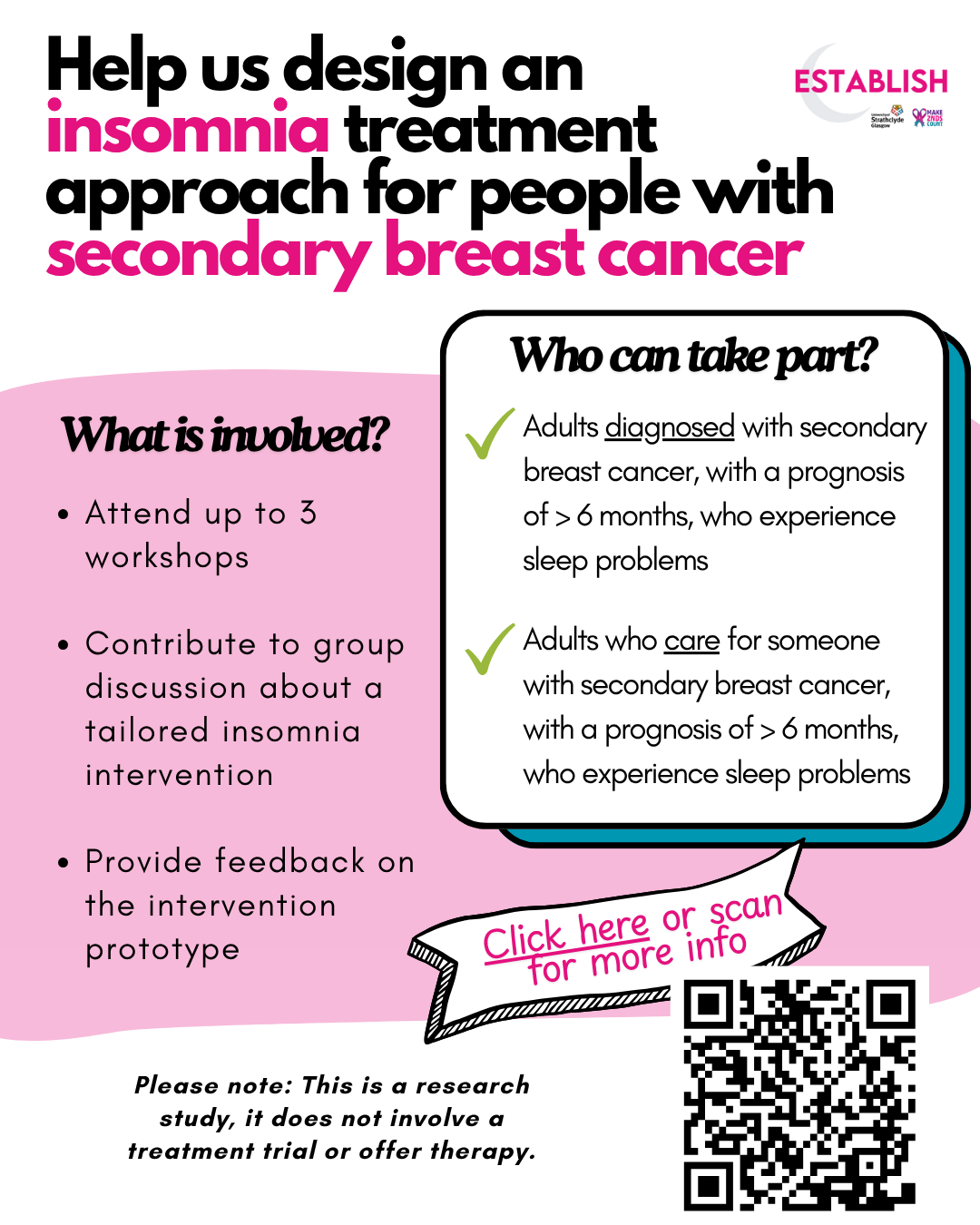 At the Strathclyde Sleep Centre, we are working on a new 3-year project, funded by Make 2nds Count, to look at the impact of insomnia in people living with secondary breast cancer and to co-produce a new treatment to address it.